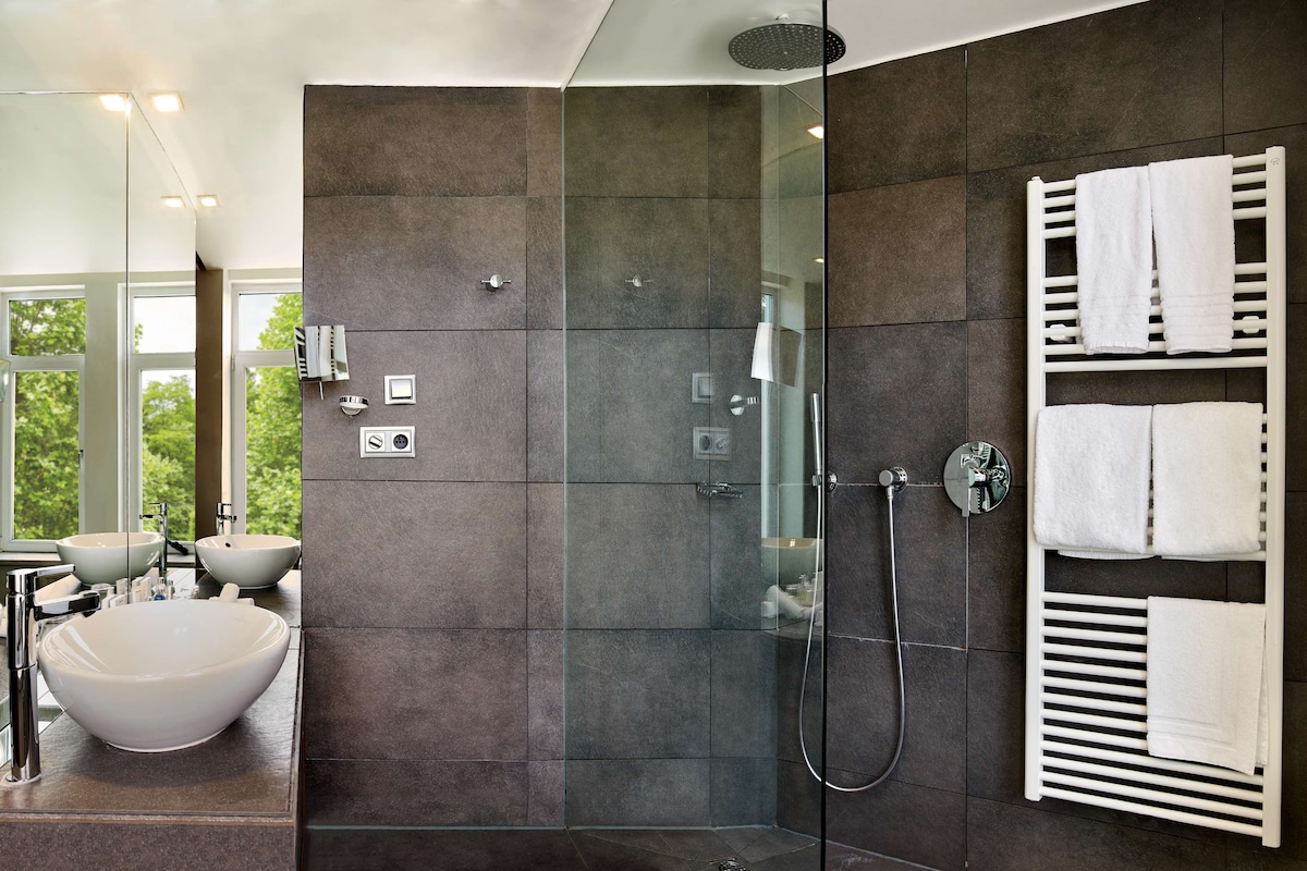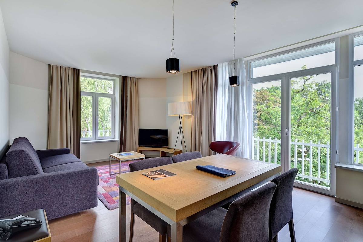 De zeer ruime Suites (ca 54 m²) hebben een apart woon- en slaapgedeelte en zijn voorzien van balkon, 1 tweepersoonsbed (kingsize), slaapbank, flatscreen televisie, wifi, bureau, zithoek, individueel regelbare klimaatbeheersing, minibar, kluisje, koffie- en theefaciliteiten, radio, verwarming en badkamer met bad/douche, toilet, wastafel, haardroger, badjassen, slippers en gratis toiletartikelen.