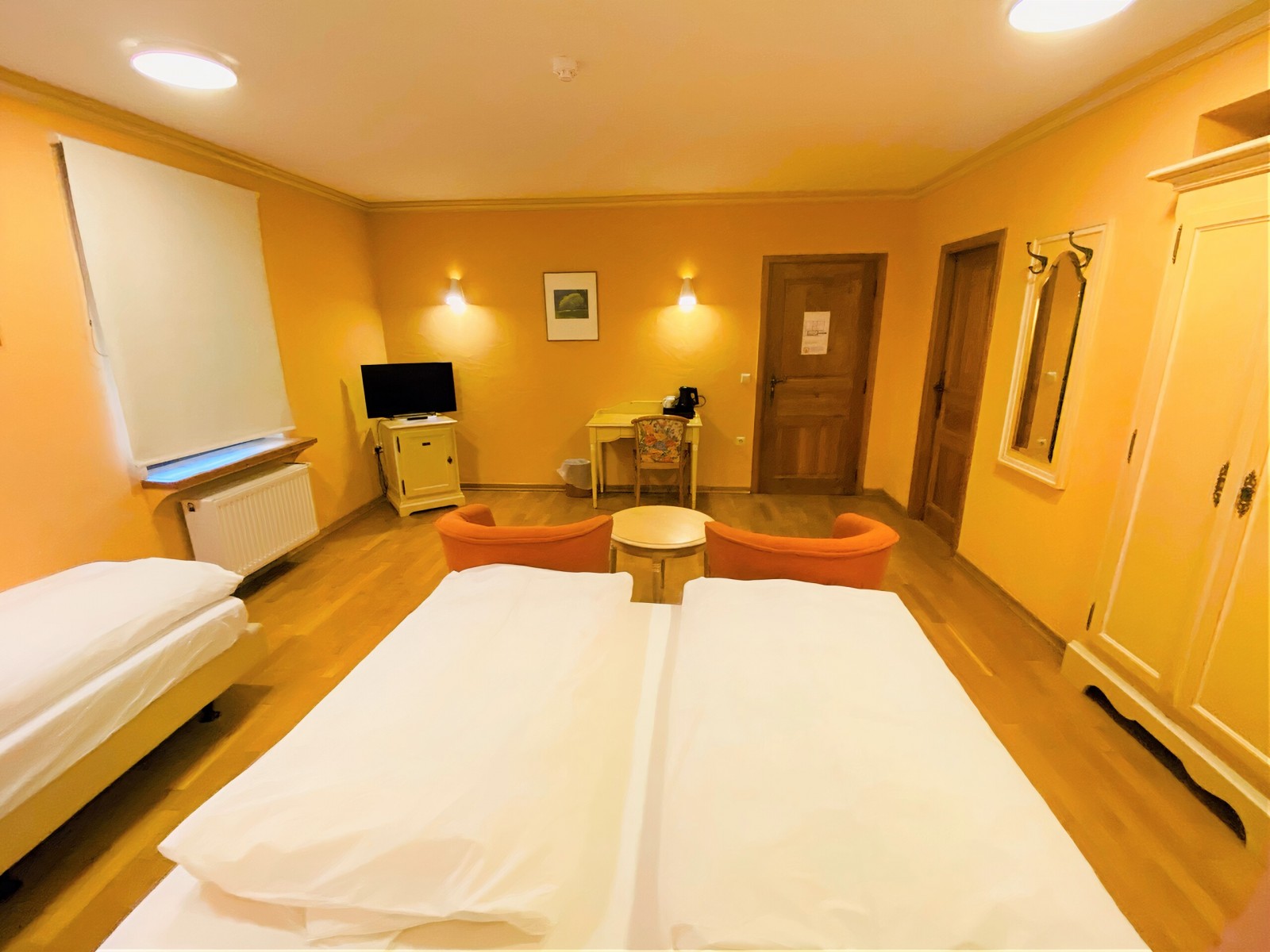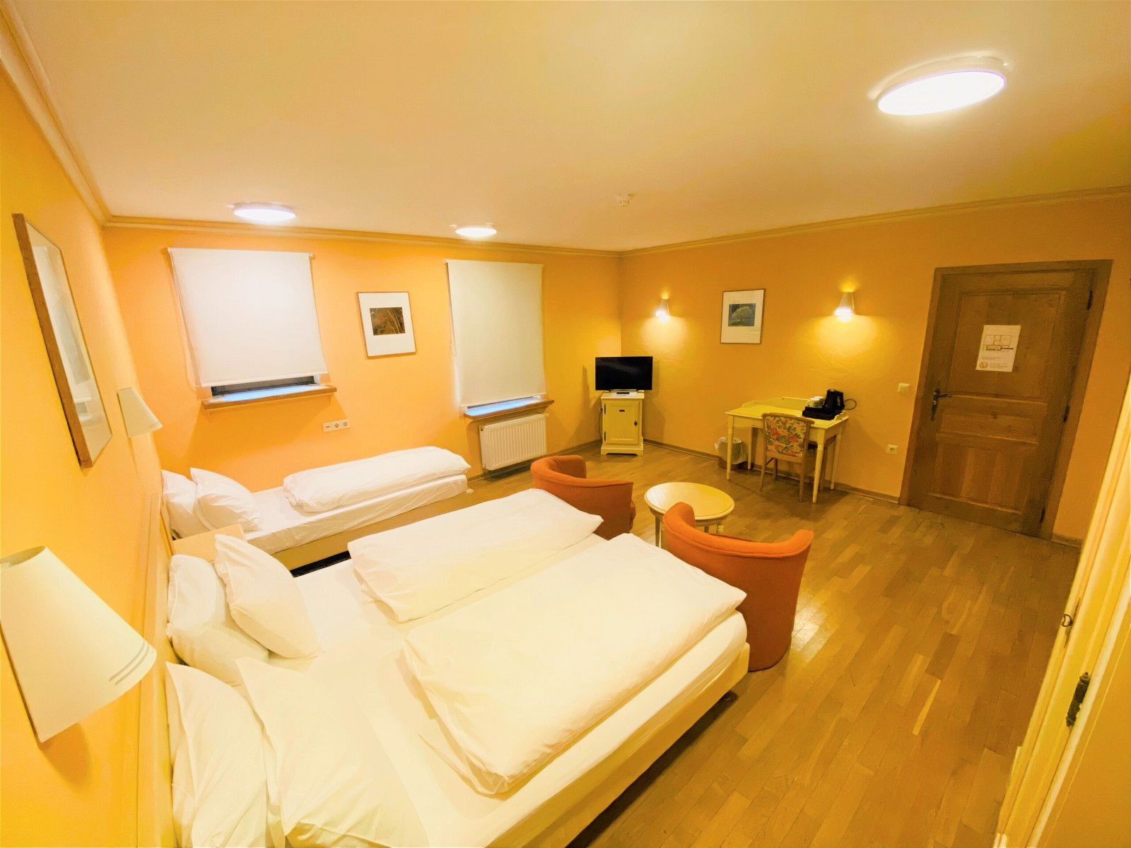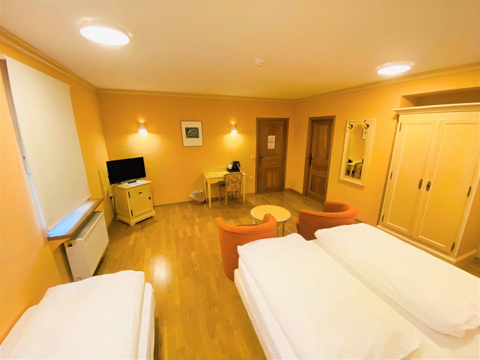 De ruime Familiekamer (30 m²) biedt uitzihct op de rivier en is voorzien van 1 groot tweepersoonsbed en 2 eenpersoonsbedden (2 aparte slaapkamers), zithoek, flatscreen-tv, bureau, koffie- en theefaciliteiten, verwarming, koelkast en badkamer met bad, toilet, wastafel, haardroger en gratis toiletartikelen.