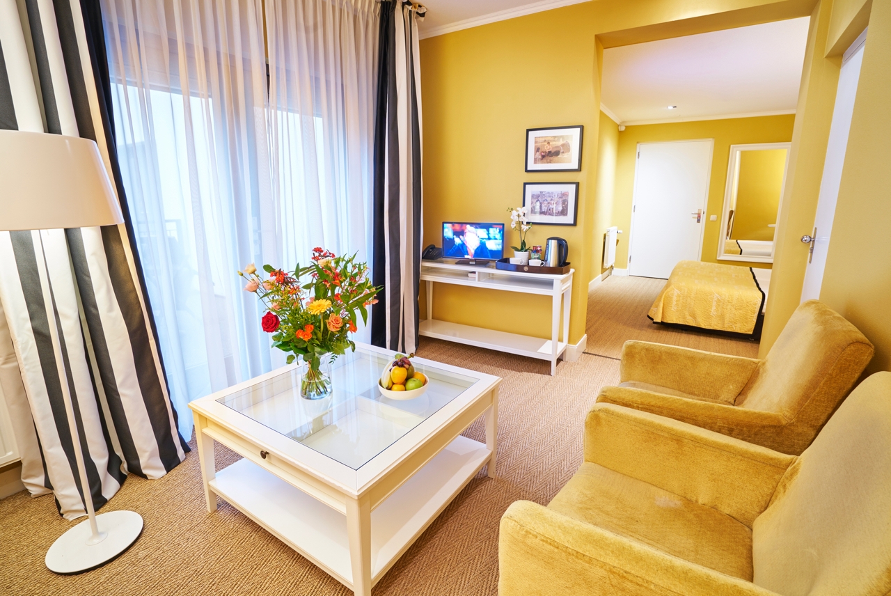 De zeer ruime Junior suites (32 m²) hebben een aparte zithoek met bank en zijn voorzien van Hollywood twin Auping boxspringbedden, flatscreen televisie, wifi, bureau, koffie- en theefaciliteiten (Nespresso), kluisje, zithoek, verwarming en badkamer met douche, toilet, haardroger en toiletartikelen. Enkele Junior suites beschikken over een balkon.