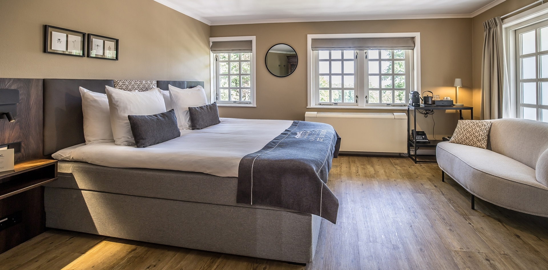 De sfeervol ingerichte Deluxe kamers hebben een balkon met uitzicht van de Hellendoorns berg en voorzien van 1 extra groot tweepersoonsbed, zithoek, LCD televisie, telefoon, koffie- en theefaciliteiten, kofferrek, bureau, kluis, gratis WiFi, airconditioning en badkamer met douche, toilet, haardroger en toiletartikelen.